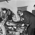 Het Reuvers revue-gezelschap met de voorstelling "Ich druim mich d'n hemel ..." Meester "Kwaer" (Aquarius), gespeeld door Ger Apeldoorn, geeft in de zevende klas uitleg over de werking van een motor aan zijn "Pummels". Van links naar rechts Wim Betrams (Betje) - Sef Apeldoorn - Toën Hendriks - Lei Driessen - Ger Apeldoorn - Jos Linssen - NN |