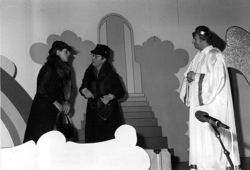 Het Reuvers revue-gezelschap met de voorstelling "Ich druim mich d'n hemel ..." Op de foto "Twiej Ruiverse sjnebbels" in d'n hemel. Links Wies Leipzig-Pollen, midden Josë Janssen - Pollen (Beide dochters van Laurens Pollen) en rechts als engel "Betje" (Wim Bertrams) |