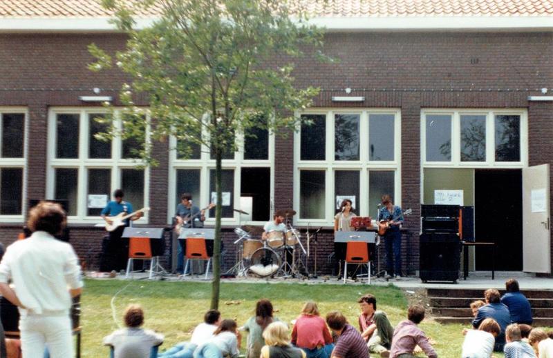 Gebeurtenissen | Een optreden van de groep "THEI" In de Schakel met achter de piano Huub Timmermans (Tim), achter het drumstel Arno Wassen. Saxofoon Sjaak Geerlings, zang Ge Titulaer en gitaar Sjaak Janssen | Pastoor Vranckenlaan 16 | Reuver | 1980 | ||||