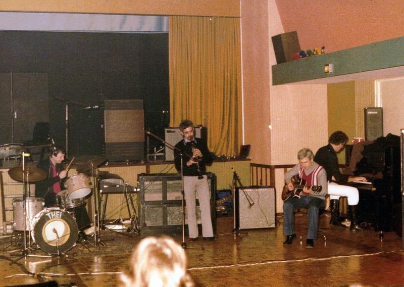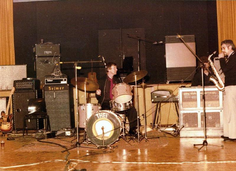 Een optreden van de groep "THEI" In de Schakel met achter de drums Arno Wassen en saxofoon Sjaak Geerlings. |