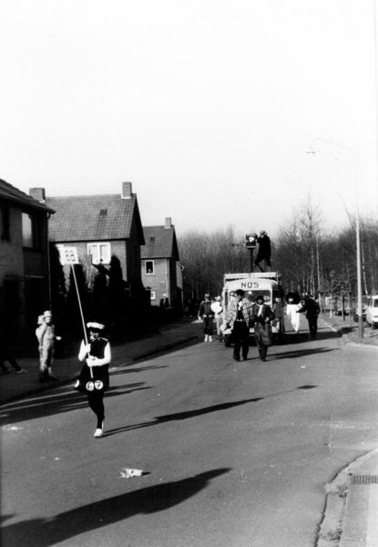 Carnaval | Vriendengroep Moeketoos neemt deel aan de carnavalsoptocht met een nagebouwde NOS wagen. Voorop als reporter André Janssen. | Beukelstraat | Offenbeek | |||||