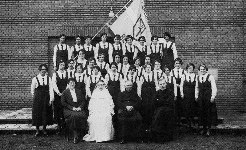 Een groepsfoto van de Katholiek Jonge Vrouwenvereniging (K.J.V. ) vóór het Piusgebouw. Vooraan van links naar rechts: Mej. E v.d. Velden, Zuster Cleta, pastoor Viegen en kapelaan Lemmens. |