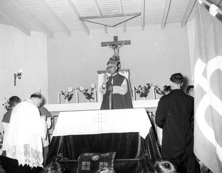Kerk en religie | Mgr. Don Joao Pereira Venancio (Bisschop van Leiria-Fatima) bracht een bezoek aan Reuver en deed daarbij een heilige mis in de noodkerk in Offenbeek. | Keulseweg 91a | Offenbeek | 20-8-1960 | 1960 | |||