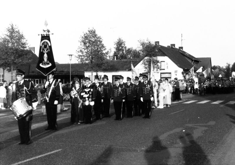 Verenigingen en organisaties | Meiboomviering in de tachtiger jaren. De schutterij en fluitenkorps. Het richten van de boom. Rechts Jan Killaars. | Keulseweg 96 | Offenbeek | 1985 | ||||