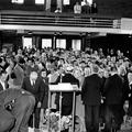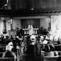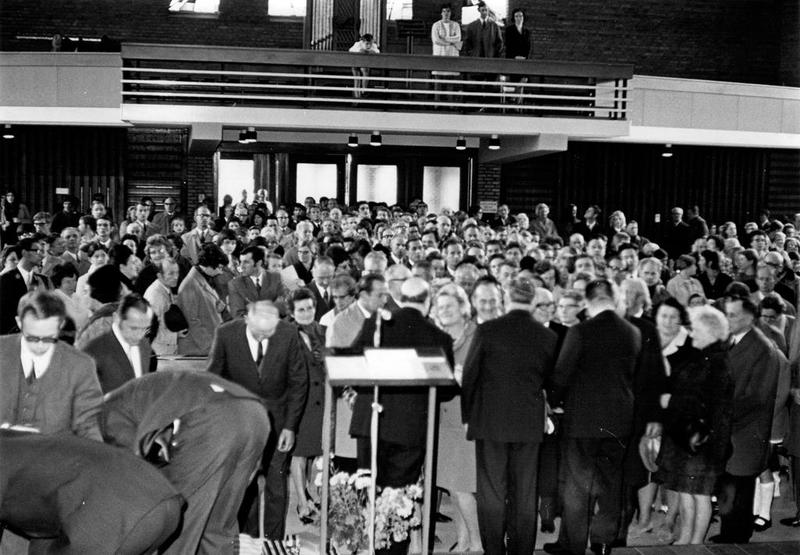 Voordat de nieuwe Fatimakerk in gebruik werd genomen moeten de parochianen en de paters Clarentijnen zich van 1956 tot 1964 behelpen in een noodkerk in zaal de Koupman. Op de foto een bruiloftsmis |