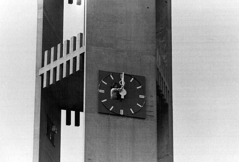 Kerk en religie | Het uurwerk werd in de toren van de Fatimakerk geplaatst door onder andere Jan Slabbers (hier op de foto), medewerker van Killaars-Electro | Keulseweg 99 | Offenbeek | 1973 | ||||