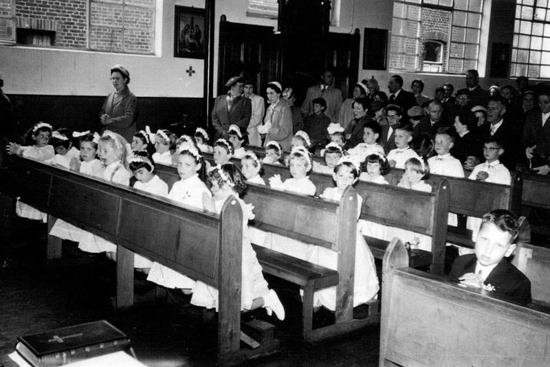 Kerk en religie | Communicantjes uit Offenbeek in de noodkerk gevestigd in zaal de Koupman | Keulseweg 91a | Offenbeek | 1963 | ||||