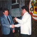 Carnaval | Har Geraeds krijgt uit handen van Pierre Pubben een herinneringsspeldje voor deelname feestcomité 44 jarig bestaan CV De Windjbuujels. | Pastoor Vranckenlaan 112 | Reuver | 1998 | ||||