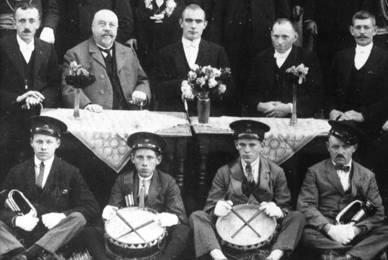 Enkele roemruchte Reuvernaren (Offenbekers) uit het eerste kwart van de 20e eeuw. Peter Killaars (de Sjoester), Jac Laumans (beschermheer schutterij), Pie Theunissen (de Koupman), Peter Franssen, Graad Peulen (de Paal). Op de grond zittend: Drees Weyers , Pierre Franssen, Naad van Willick en Sjang Geelen. |