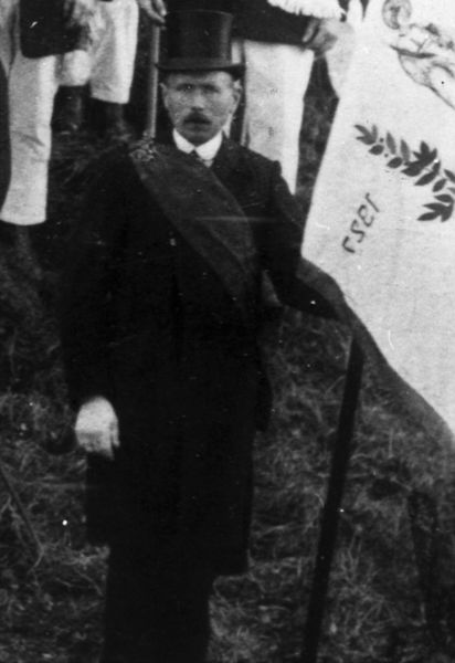 Verenigingen en organisaties | Chris Verstappen (Sjtappes Chris) als vaandeldrager van de schutterij in 1927. Het 25-jarig bestaan werd gevierd. Zie het nieuwe vaandel. | Offenbeek | 1927 | |||||