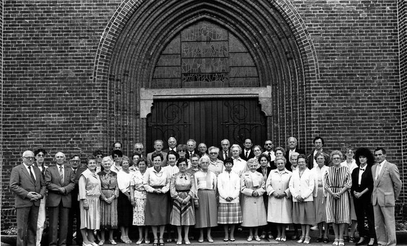 Het kerkkoor van de St. Lambertuskerk onder leiding van J. Hodselmans bij het 80-jarig bestaan in november 1984. Geheel links staat pastoor Leën en geheel rechts de voorzitter van het koor Toon Hendriks |