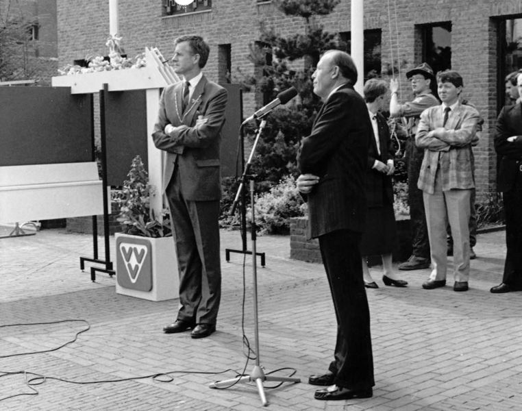 Oranjefeest. Burgemeester Nuytens en Wiel van Willick voorzitter Oranjecomité. Rechts wethouder Fons Verdonck en pastoor Franken. |