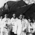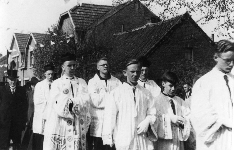 Misdienaars brengen de Reuverse neomist Frans Rutten naar de St. Lambertuskerk voor zijn eerste heilige Mis. |
