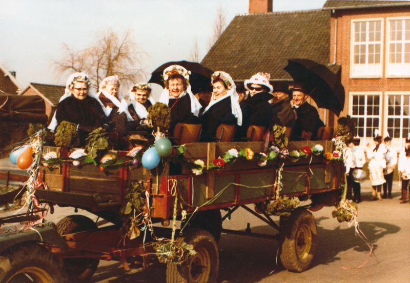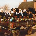 Het gezelschap boerenbroeloft Offenbeek in de optocht. Op tractor Har Franssen . Op de wagen vlnr: Miena Franssen, Marie Strijbos, Maria Verstappen en Marie Bongerds. Daar achter Lei Teunissen (Koesse Lei) en Dreeske Ottenheim. |