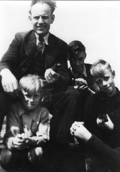Kauwkes vangen in de kerktoren samen met Pierre Pubben (koster). Rechts naast de koster staat Theo Janssen en helemaal rechts Pierre Janssen. |