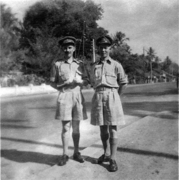 Twee soldaten in tropenuniform tijdens de tweede Wereldoorlog. De militair rechts is Pierre Dorssers uit Offenbeek. Zoon van Dorssers Joeën. Rang sergeant. |