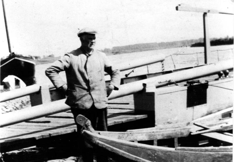 Vervoer overig | Hendrik Smeets was veerman op het veer tussen Asselt en Buggenum en nam daarnaast als beroepsvisser deel aan het visschokken (vissen met behulp van stroom). Op de voorgrond rechts ligt de gierboot van het veer. | Dorpsstraat 100 | Buggenum | |||||