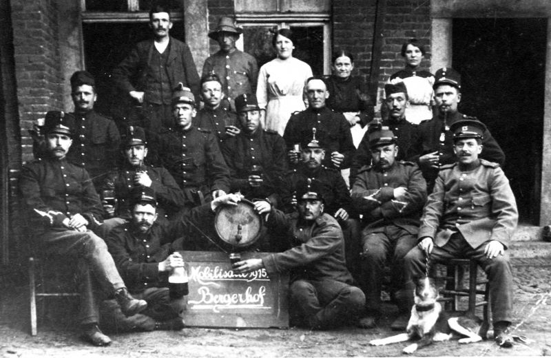 Oorlog | Een groep militairen die verantwoordelijk is voor de grensbewaking in Reuver. Zij waren ondergebracht op Bergerhof bij Peter Sangers, die in de bovenste rij helemaal links staat. Naast hem de schaapsherder (sjieëper) in zijn dienst en de huishoudster alsmede 2 ‘maagden’. De foto is genomen op de binnenplaats van boerderij Bergerhof aan de Bergerhofweg te Reuver, waar nog steeds een veeteeltbedrijf is. | Bergerhofweg 15 | Offenbeek | 1915 | ||||