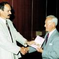 Heemkundevereniging | Eregast Sjeng Geurts uit Belfeld ontvangt het jaarboek 1991 van vz. Wiel Luys | Schoolstraat 11 | Belfeld | 1992 | ||||