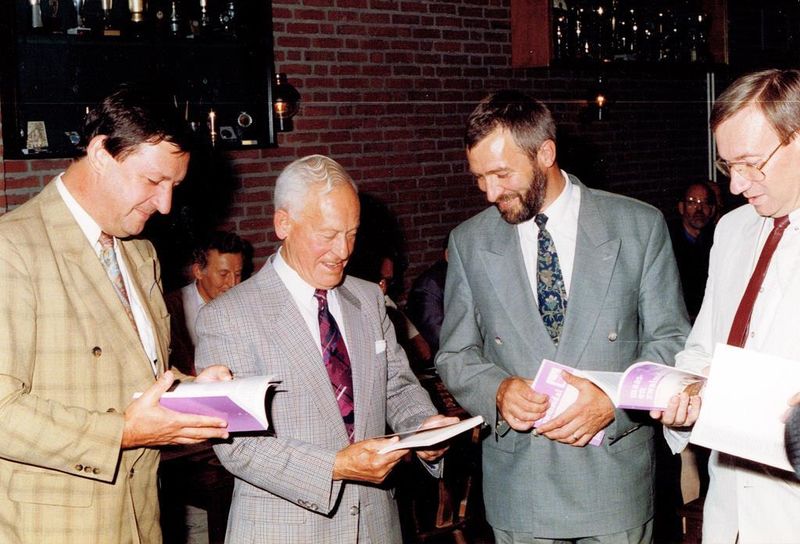 Heemkundevereniging | Burgemeester Peeters (Belfeld), Sjeng Geurts, Ton Verlijsdonk (wethouder gemeente Beesel) en Har van der Linden bekijken het jaarboek van 1991. (vlnr.) | Schoolstraat 11 | Belfeld | 1992 | ||||