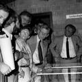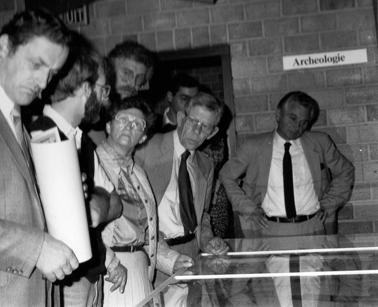 Diverse bezoekers aan de door de heemkundevereniging Maas en Swalmdal georganiseerde tentoonstelling " Belvend Vreuger " . Links vooraan staat de burgemeester van Belfeld dhr Peeters. |