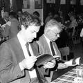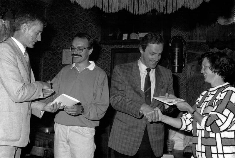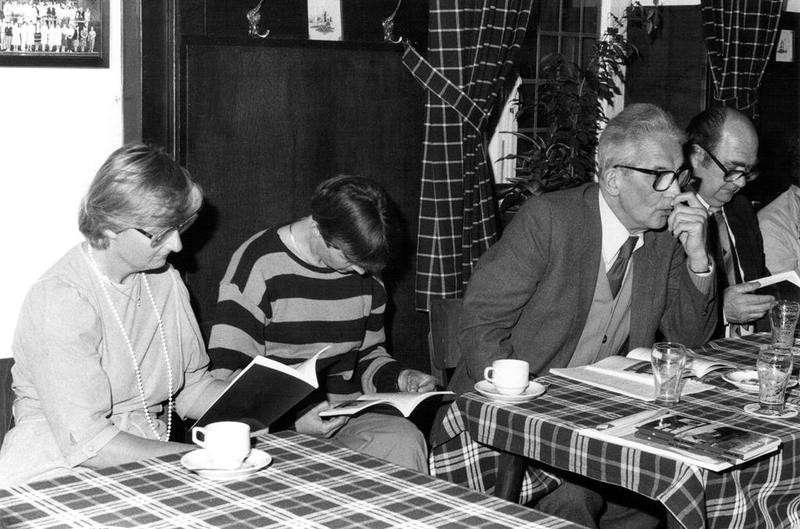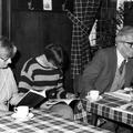 Bezoekers tijdens de uitreiking van het jaarboek 1984 in de Paersstal. Van links naar rechts: Miep v. Avesaath, Els Thissen, Giel Geraedts, Sjra Sanders. |
