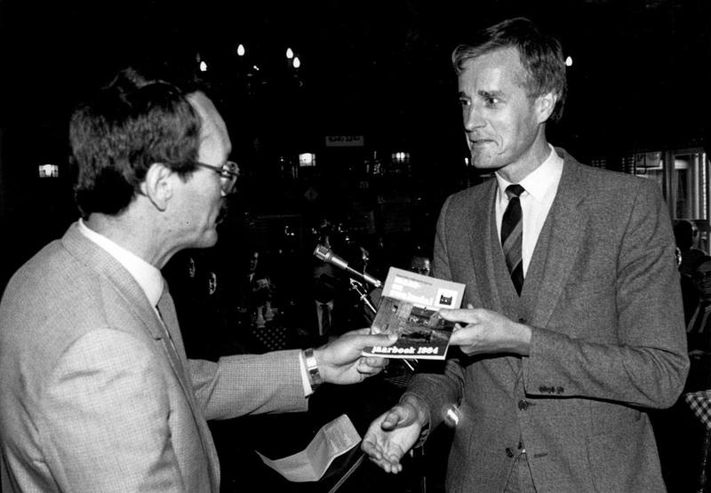 Heemkundevereniging | Burgemeester Nuytens ontvang het jaarboek 1984 uit handen van voorzitter Wiel Luys | Keulseweg 103 | Offenbeek | 1985 | ||||