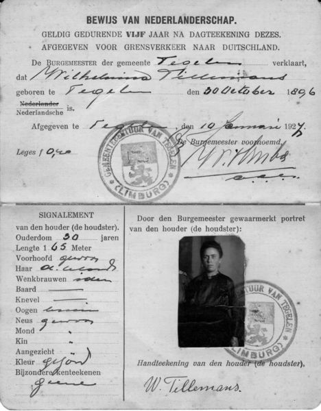Ook vroeger had men al een "Bewijs van Nederlanderschap" nodig. Wilhelmina Tillemans, echtgenote van Engelbertus Johannes Paar (melkhandelaar) had ook zo'n bewijs. |