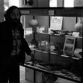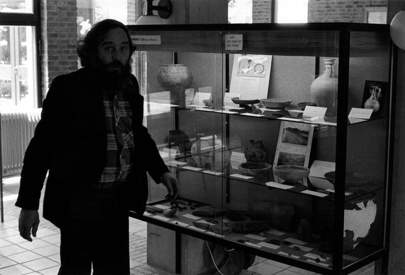 Gebeurtenissen | Heer Storms bij een vitrinekast met gebruiksvoorwerpen tijdens de door de Archeologische Werkgroep Beesel georganiseerde tentoonstelling "Bieslo aen die Maese " in de hal van het gemeentehuis. | Raadhuisplein 1 | Reuver | 1980 | ||||