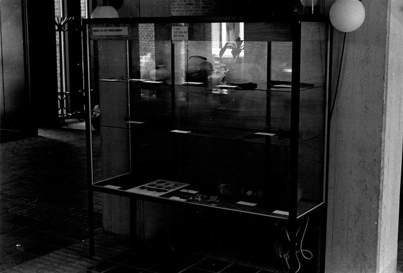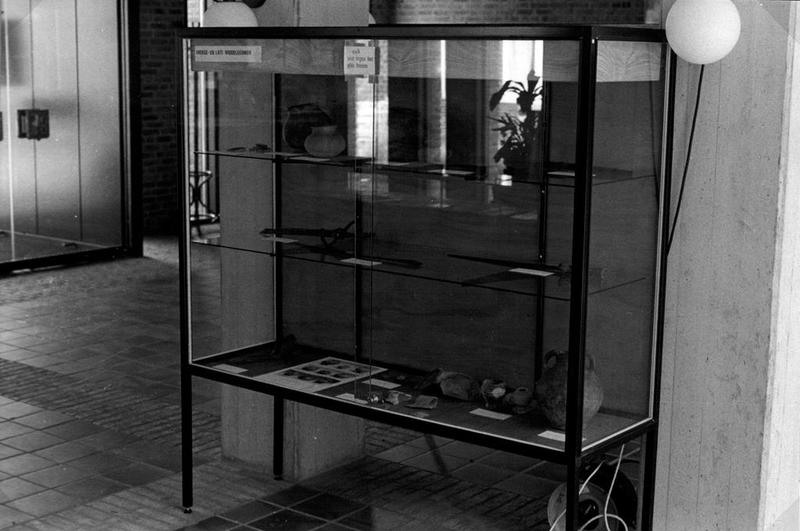 Gebeurtenissen | Een vitrinekast met gebruiksvoorwerpen tijdens de door de Archeologische Werkgroep Beesel georganiseerde tentoonstelling "Bieslo aen die Maese " in de hal van het gemeentehuis. | Raadhuisplein 1 | Reuver | 1980 | ||||
