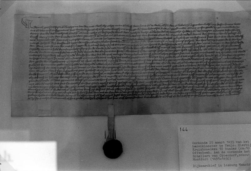 Gebeurtenissen | Een oorkonde uit 1435 van het Kruisherenklooster in Venlo te zien tijdens de door de Archeologische Werkgroep Beesel georganiseerde tentoonstelling "Bieslo aen die Maese " in de hal van het gemeentehuis. | Raadhuisplein 1 | Reuver | 1980 | ||||