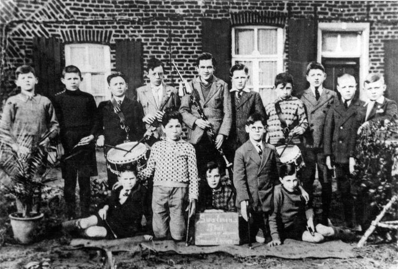 De oprichters van het Trommel en Fluiterkorps Heide hier verzameld in de tijd voorafgaande aan de uiteindelijke oprichting in 1945. met van links naar rechts: 1 ? 2 ? 3 Sef Bruijnen (een van de oprichters) 4 tm 10 ? knielend 1 Heymann 2 Langen 3 ?? 4 Har Geraedts 5 ? |