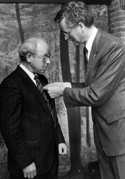Jac Schrijvers krijgt de zilveren speld door burgemeester Nuytens opgespeld ivm zijn grote verdiensten voor tafeltennisvereniging NOAD. |
