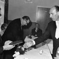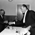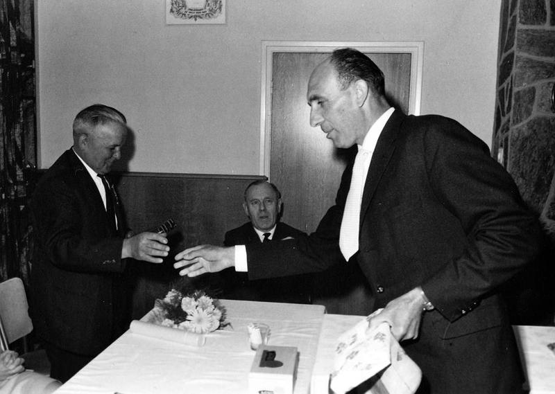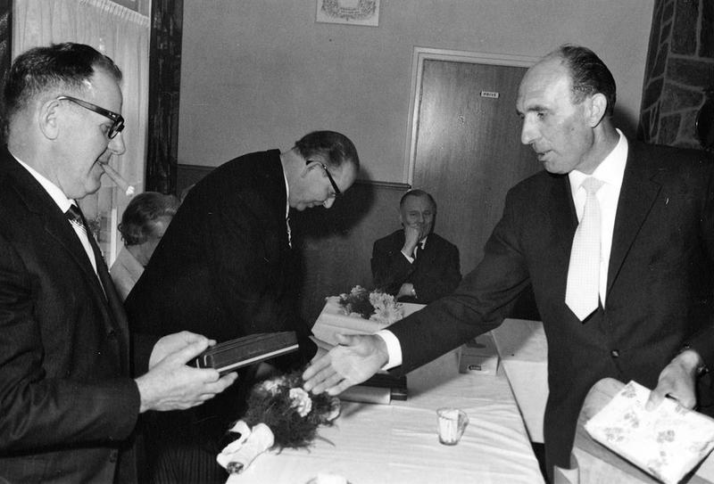 Fabrieken / Bedrijven | Bedrijfsleider van Janssen-Willemsen, Jeu Berben, feliciteert Baer Janssen. | Greswarenstraat 3 | Offenbeek | 1965 | ||||