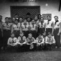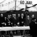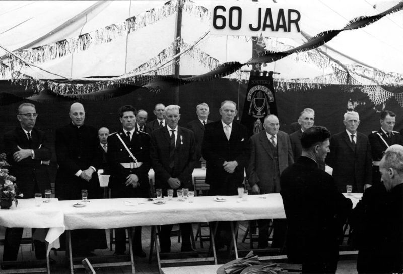 Receptie van schutterij St. Barbara ter ere van hun 60 jarig bestaan. Op de foto zijn van links naar rechts te zien; 1 Jac Laumans 2 Pater Weiss 3 Hendrik vd Velden (achter aan) 4 Jan Naus 5 Graet Peulen 6 Engel Weijers 7 Peter Franssen (Sjlachter Pieter) 8 Joep Stevens (Klompe Joep) 9 Keun Franssen 10 Piet Muisenberg |