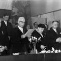Afscheid van Burgemeester Claessen in het klooster te Reuver. Hij sluit de laatste vergadering van zijn ambtsperiode af (1946 - 1959). Van links naar rechts staan achter de tafel: Sjeng Steeghs - Burgemeester Claessen - Mevrouw Claessen - Frits Cremers - Lei Peeters |