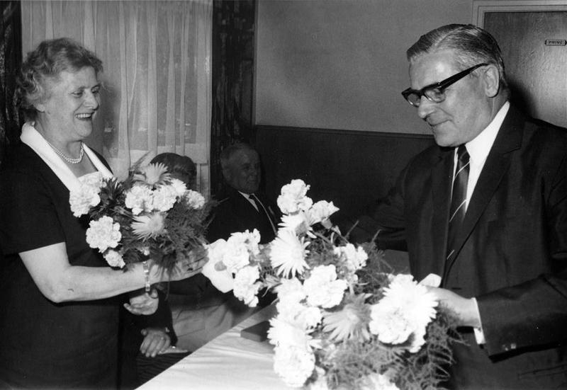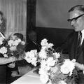 Fabrieken / Bedrijven | Mevr. Wevers krijgt een bloemetje van dir. Rein Janssen (fabrikant Janssen-Willemsen) ivm jubileum van haar man. | Greswarenstraat 3 | Offenbeek | 1965 | ||||
