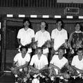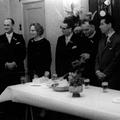 Receptie van de Toneelvereniging van Reuver ter ere van hun 25 jarig jubileum. Van links naar rechts Wiel Achten - Hovens - Mevr. Cremers - ? -Past. vd Broek - Levels Felix Simons (Colberts Matrassen) |
