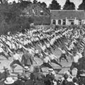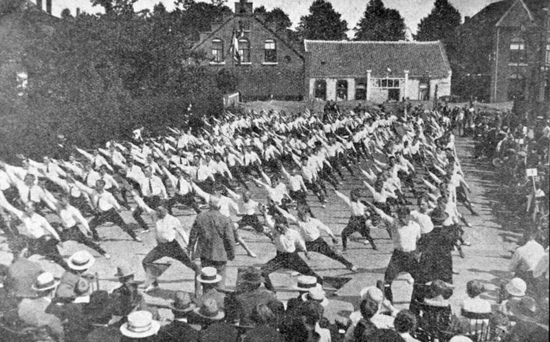 Gymnastiek en atletiek vereniging "Hercules" viert haar 25 jarige jubileum met het organiseren van sportfeesten in het centrum van Reuver. Lichamelijke oefeningen op het marktplein. Op de achtergrond ligt zaal Paquay met daarnaast de garage en winkel van Harrie Dohmen |
