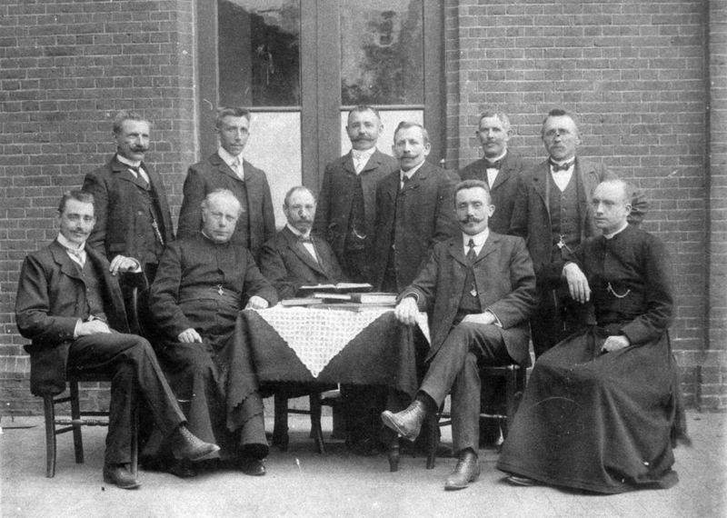 Het Bestuur van Sobrietas (De Blauwe knoop). Van links naar rechts: Zittend 1 G. Goossens (Stokse Sjrake ) 2 J. Vrancken (Past. Oprichter) 3 L. Wolfs (Hoofd van de school) 4 Peter v Eyck 5 Camps(Kapelaan) Staande 1 F. Rutten 2 Willem Janssen 3 W. Reijnders 4 Hubert Teunissen 5 F. Franssen 6 Antoon Rovers |