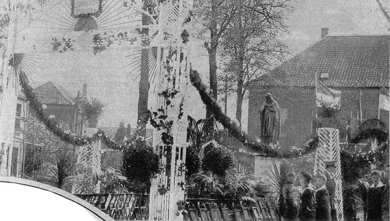 De inzegenings plechtigheid van het H.Hart beeld voor het oude raadhuis in Reuver. |