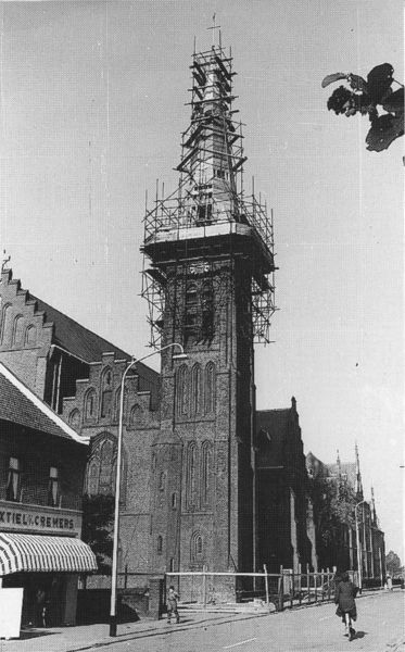 De bouw van de nieuwe torenspits van de St.Lambertuskerk in 1956 - 1957. Links is de textielwinkel van Cremers. |