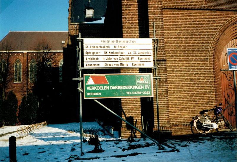 Kerk en religie | Bord met aankondiging van het herstel van de aardbevingsschade in de St.Lambertuskerk | Karel Doormanlaan 2 | Reuver | 1-1-1996 | 1996 | |||