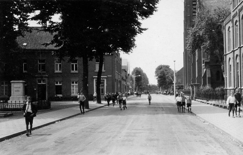 Pastoor Vranckenlaan. Links het Heilig Hartbeeld en het oude gemeentehuis, rechts het klooster en de St. Lambertuskerk. Waarschijnlijk is de Lagere Jongensschool St. Lambertus net uit. |