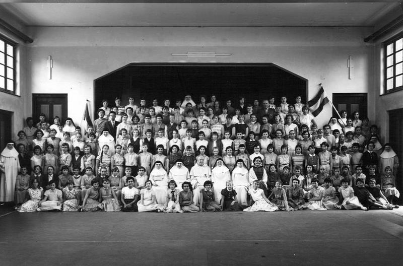 Groepsfoto U.L.O kweekschool. Het klooster werd in de jaren 1890-1891 gebouwd naar plannen van E. Corbey voor de Domincanessen van de H. Catharina van Siena te Voorschoten. Het complex bevatte een kloostergedeelte aan de de zuidzijde, een lagere leerschool in het midden en een instituut voor bejaarden rechts. |
