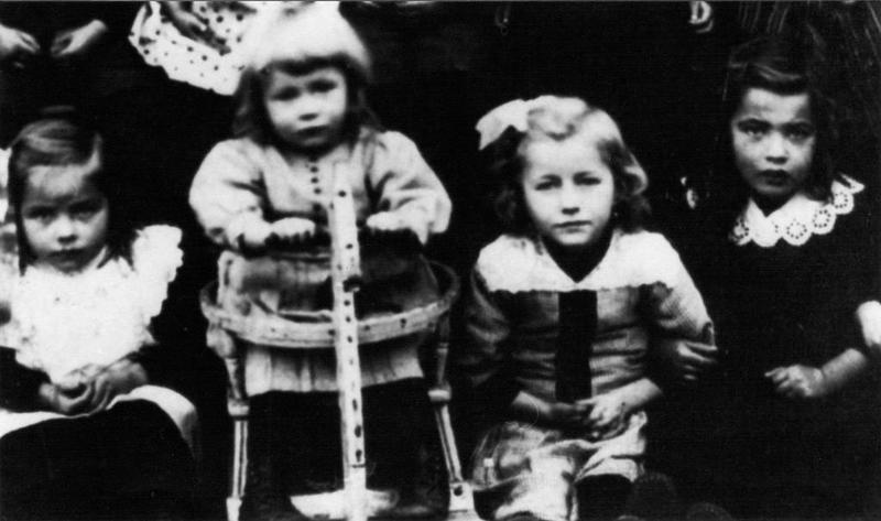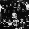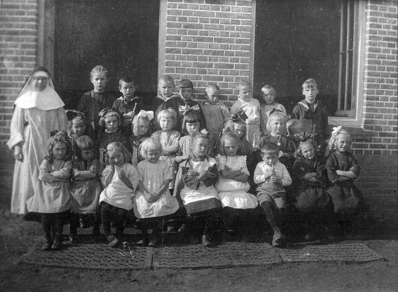 Deel Klassenfoto van de Fröbelschool van de zusters (Foto 020-008) tweede van links Toos Gossens en helemaal rechts Maria Reynders |