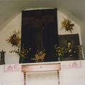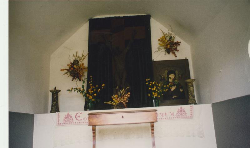 Interieur wegkapel. De kapel is wit gestuct. Langs de wanden is een lage donkere lambrisering aangebracht. Tegen de achterwand bevindt zich een altaar waarboven een onbeschilderd kruis uit ca. 1700. Daarnaast staat een kopie van de icoon van Onze-Lieve-Vrouw van Altijddurende Bijstand. Voor het altaar staat een bidstoel. |