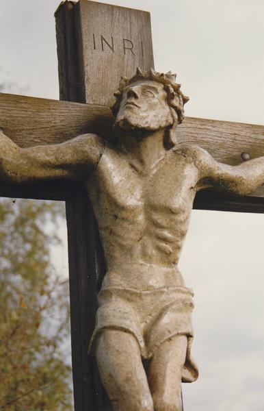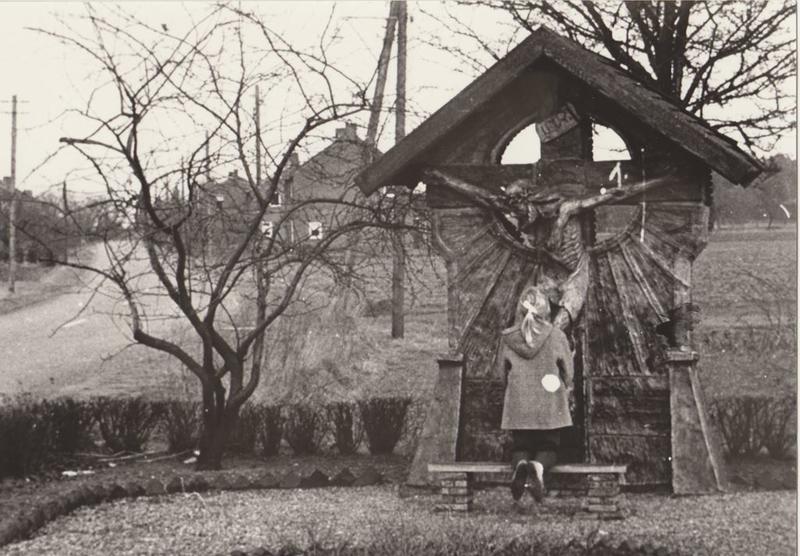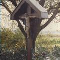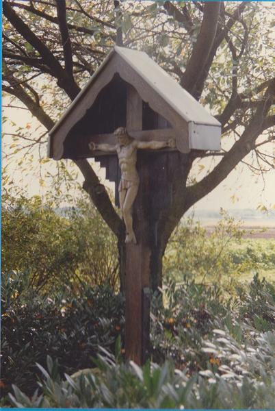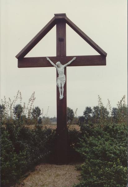 Veldkruis. Het oorspronkelijke kruis op deze plek werd in 1944 door een granaatinslag vernield. Atelier: Sint Joris Ontwerper: C. Grips |