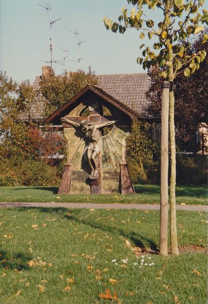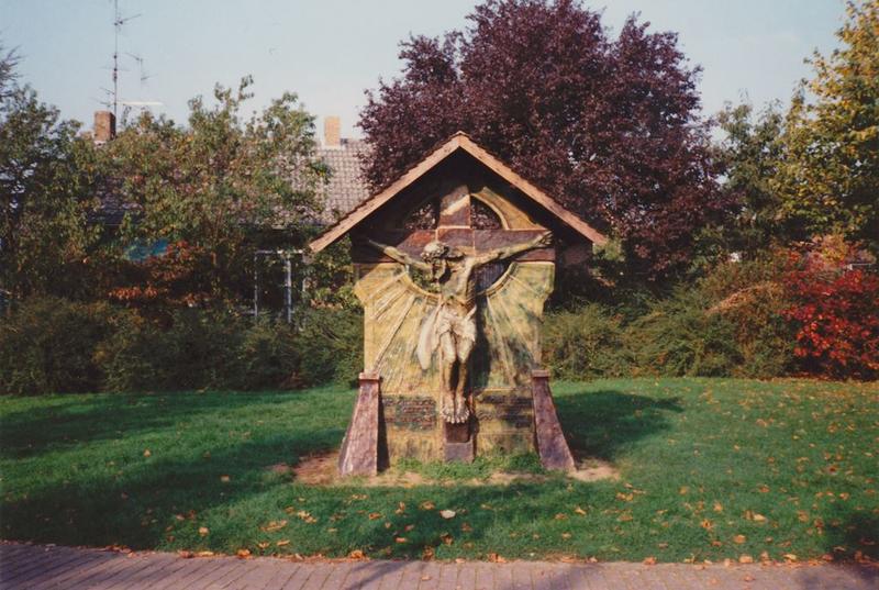 Kruisbeeld Sint Jorisstraat uit 1950. Het oorspronkelijke kruis op deze plek werd in 1944 door een granaatinslag vernield. Atelier: Sint Joris Ontwerper: C. Grips |