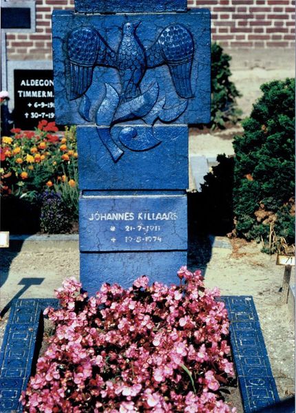 Grafmonument Johannes Killaars Grafmonument:kruis uit keramiek Keramiek: Teeuwen. Ontwerp en uitvoering: Daan Wiltschut(glazenier). Het was niet de bedoeling dat het monument blauw zou zijn. Tijdens het stoken werd de verkeerde temperatuur ingesteld. Men heeft er nog aan getwijfel |